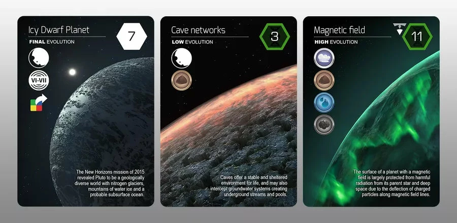 The thematics of the game have been developed with an eye on the science, led by a scientist working on NASA’s search for life on Mars. Evolution cards thematically include all kinds of planetary phenomenon, from asteroid impacts, atmospheric effects, to geological events. Final Evolution cards mark the relatively stable state a planet is in at the end of the solar system’s development and include classifications for the final planets such as Hot Jupiter or an uninhabitable frozen dwarf planet.