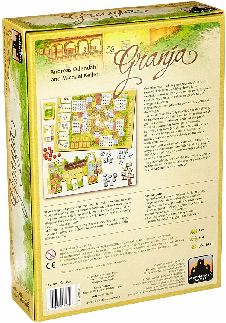In La Granja, players control small farms by the Alpich pond near the village of Esporles on the island of Mallorca. Over time, the players develop their farms and deliver goods to the village. Players are vying to earn the title of “La Granja” for their country estate!