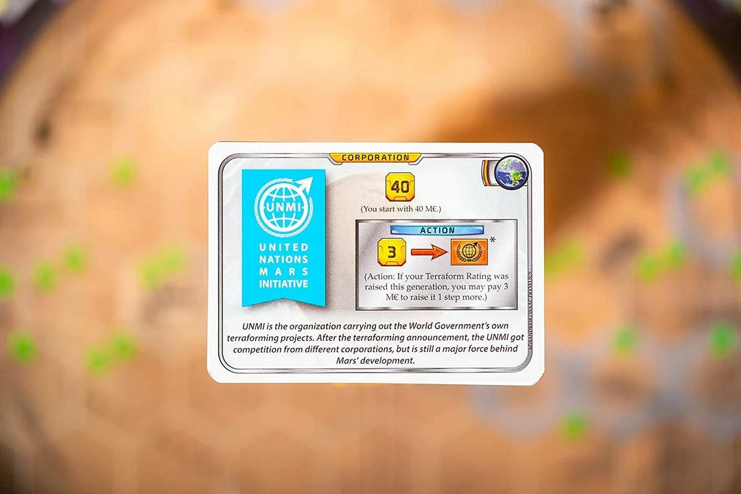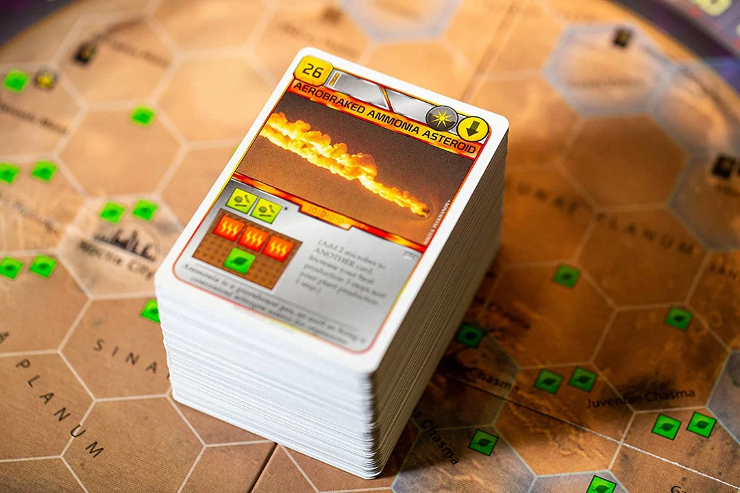 The players acquire unique project cards (from over two hundred different ones) by buying them to their hand. The projects (cards) can represent anything from introducing plant life or Animals, hurling asteroids at the surface, building cities, to mining the moons of Jupiter and establish greenhouse gas industries to heat up the atmosphere. The cards can give you immediate bonuses, as well as increasing your production of different resources. Many cards also have requirements and they become playable when the temperature, oxygen, or ocean coverage increases enough. Buying cards is costly, so there is a balance between buying cards (3 megacredits per card) and actually playing them (which can cost anything between 0 to 41 megacredits, depending on the project). Standard Projects are always available to complement your cards.
