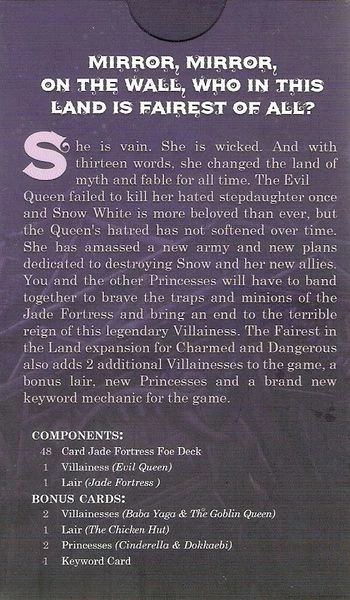 She is vain. She is wicked. And with thirteen words, she changed the land of myth and fable for all time. The Evil Queen failed to kill her hated stepdaughter once and Snow White is more beloved than ever, but the Queen’s hatred has not softened over time. She has amassed a new army and new plans dedicated to destroying Snow White and her new allies. You and the other Princesses will have to band together to brave the traps and minions of the Jade Fortress and bring an end to the terrible reign of this legendary Villainess. The Fairest in the Land expansion for Charmed and Dangerous also adds 2 additional Villainesses to the game, a bonus lair, new Princesses and a brand new keyword mechanic for the game.
