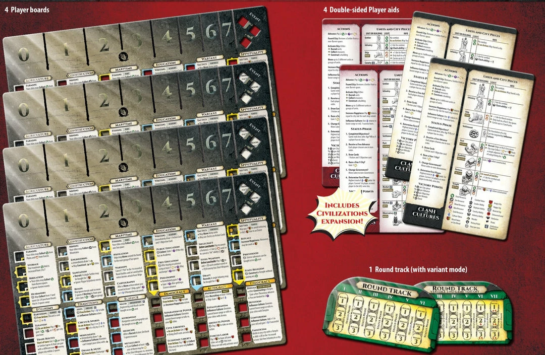 InΒ Clash of Cultures, each player leads a civilization from a single settlement to a mighty empire. Players must explore their surroundings, build large cities, research advances and conquer those who stand in the way. The game features a modular board for players to explore, 48 distinct advances, seven mighty wonders, and loads of miniatures and cards. The winner will create a culture that will be remembered and admired for millennia.