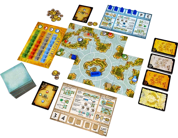 Inย Akrotiriย โ which combines tile placement, hand management, and pick-up and delivery โ players place land tiles in order to make the board match the maps that they have in hand. Players excavate temples; the ones that are harder to find and the ones further away from Thera are worth more towards victory, but the secret goal cards keep everyone guessing who the victor is until the end! May the gods forever bless you with favorable winds!