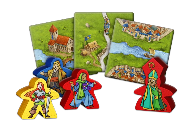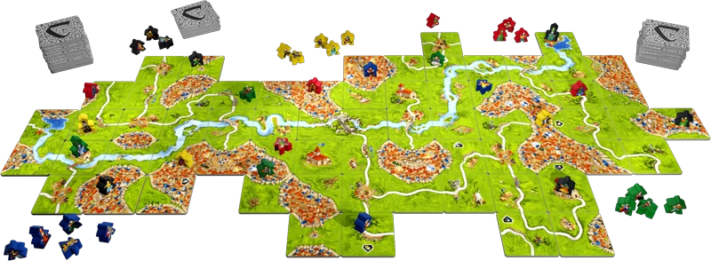 CarcassonneΒ is a tile-placement game in which the players draw and place a tile with a piece of southern French landscape on it. The tile might feature a city, a road, a cloister, grassland or some combination thereof, and it must be placed adjacent to tiles that have already been played, in such a way that cities are connected to cities, roads to roads, etcetera. Having placed a tile, the player can then decide to place one of their meeples on one of the areas on it: on the city as a knight, on the road as a robber, on a cloister as a monk, or on the grass as a farmer. When that area is complete, that meeple scores points for its owner.