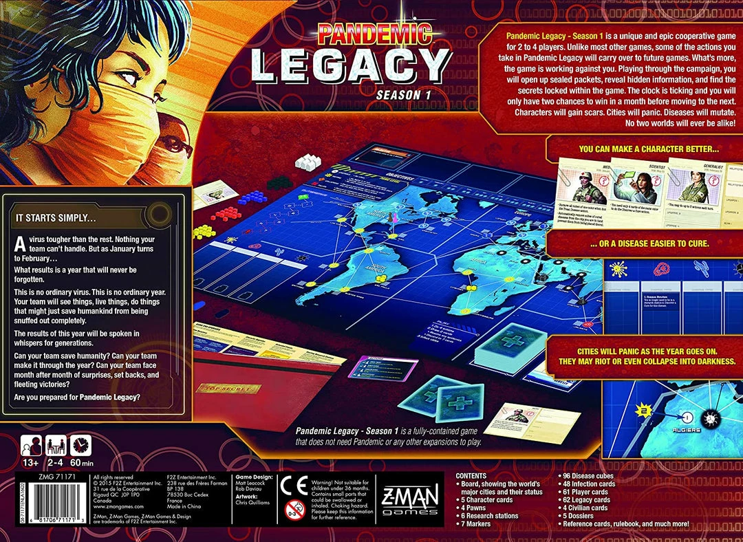 Pandemic LegacyΒ is a co-operative campaign game, with an overarching story-arc played through 12-24 sessions, depending on how well your group does at the game. At the beginning, the game starts very similar to basicΒ Pandemic, in which your team of disease-fighting specialists races against the clock to travel around the world, treating disease hotspots while researching cures for each of four plagues before they get out of hand.