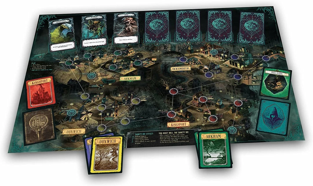Instead of curing diseases like in the original Pandemic, players seal portals and shut down cults in the classic New England fictional towns of Arkham, Dunwich, Innsmouth, and Kingsport. Can you and your fellow investigators manage to find and seal every portal in time? Hurry before you lose yourself to insanity and the evil that lurks beneath your feet…